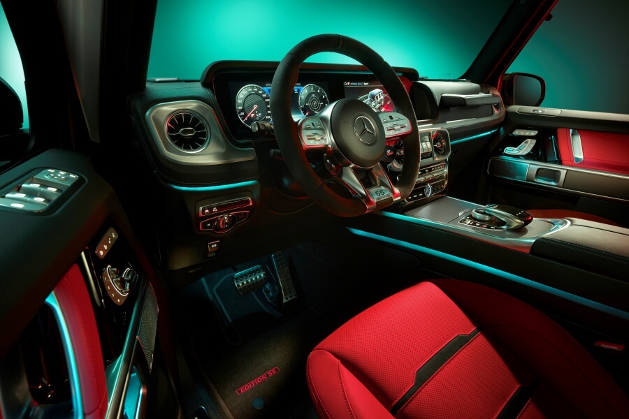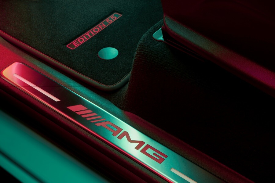 Wnętrze charakteryzuje się kontrastem czerni i czerwieni. Listwy progowe ze stali nierdzewnej z podświetlanymi na czerwono napisem AMG, a do tego czarne dywaniki AMG z kontrastującymi czerwonymi szwami oraz wyszytym czerwonym napisem „Edition 55”. Również w przypadku kierownicy zadbano o upamiętnienie rocznicy dzięki specjalnym oznaczeniom AMG oraz 55.