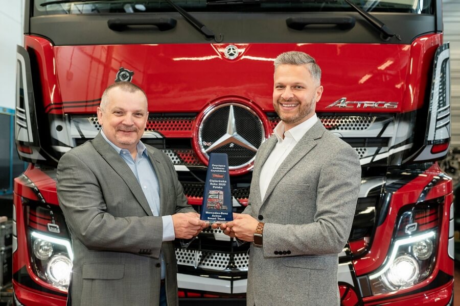 W tym roku flagowy ciągnik Mercedes-Benz zdobył go już po raz szósty! 30 września w siedzibie Mercedes-Benz Trucks Polska w Warszawie, w sali szkoleniowej, w której stanął bohater wydarzenia: Actros w malowaniu SmartTruck, odbyła się skromna, z racji pandemii, uroczystość przekazania symbolicznej statuetki.