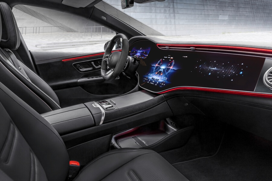 Opcjonalny MBUX Hyperscreen sprawia, że cały zestaw wskaźników jest jednym wielkim ekranem – i decyduje o estetyce całego kokpitu oraz wnętrza. Wyświetlacze o wysokiej rozdzielczości wydają się płynnie łączyć pod wspólną szklaną osłoną.