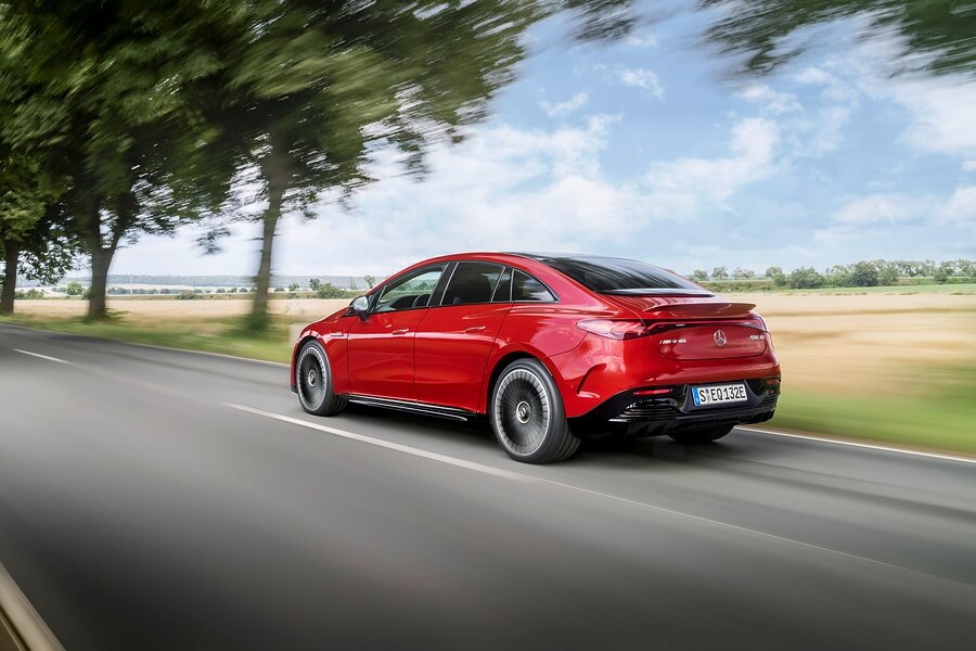- Na życzenie EQE jest dostępny ze skrętną tylną osią. Do wyboru są dwie wersje: z kątem skrętu tylnych kół do 4,5° i do 10°. W drugim przypadku średnica zawracania maleje z 12,5 do 10,7 m.
