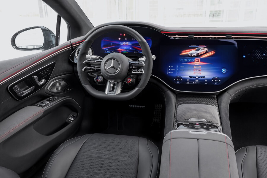 Również we wnętrzu styl EQS-a 53 4MATIC+ definiują elementy AMG, w tym sportowe fotele z czerwonymi przeszyciami obszyte skórą syntetyczną ARTICO i mikrofibrą MICROCUT lub – na życzenie – skórą nappa. Wzrok natychmiast przyciągają też kierownica AMG Performance ze spłaszczonym u dołu wieńcem oraz sportowe nakładki na pedały AMG. Standardowy ekran MBUX Hyperscreen, rozciągający się niemal na całą szerokość kabiny, wyróżniają specyficzne dla AMG menu, a także grafika wyświetlaczy (w tym opcjonalnego head-upa).