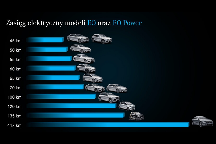 EQ – Są to modele Mercedes w 100% elektryczne. Do napędu wykorzystują wyłącznie energię elektryczną akumulowaną przez podłączenie do zewnętrznego źródła zasilania.