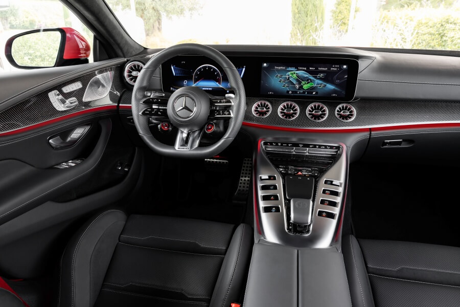 Jako nowy okręt flagowy w gamie AMG GT 4-drzwiowego Coupé, hybryda AMG GT 63 S E PERFORMANCE jest szczególnie bogato wyposażona. Otrzymała wszystkie udoskonalenia wprowadzone przy okazji ostatniego liftingu, takie jak zawieszenie AMG RIDE CONTROL+ z nowym systemem tłumienia. Standardowo na pokładzie znajduje się także szerokoekranowy kokpit i system multimedialny MBUX ze specyficznymi dla hybrydy widokami. W zestawie wskaźników kierowca może odczytać dostępny zasięg w trybie elektrycznym, zużycie energii, moc i moment obrotowy silnika elektrycznego oraz temperatury akumulatora i jednostki elektrycznej. Wysokiej jakości grafika na ekranie systemu MBUX dodatkowo wizualizuje przepływ siły napędowej w całym zespole. Pasażerowie tylnych foteli otrzymują informacje o przepływie energii oraz mocy i momencie obrotowym silnika elektrycznego na opcjonalnym wyświetlaczu systemu operacyjnego.