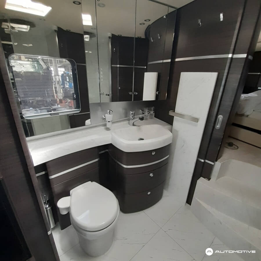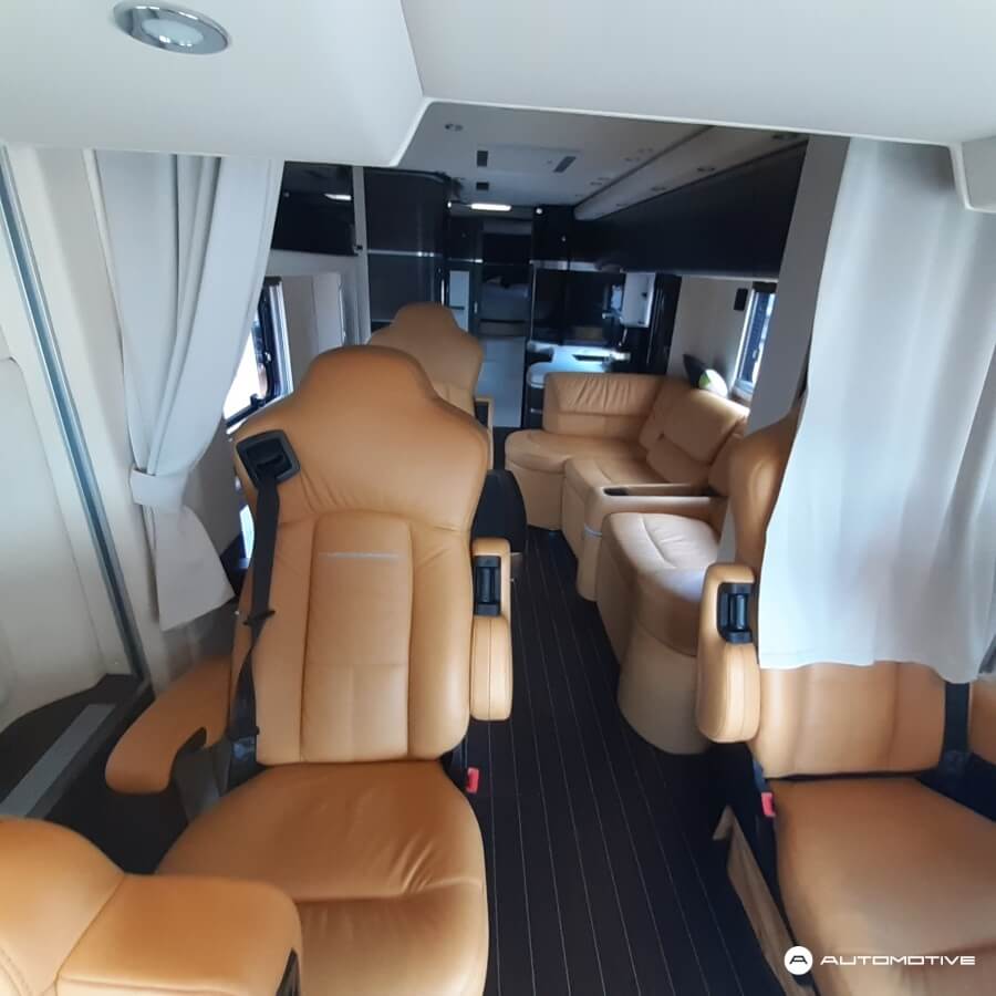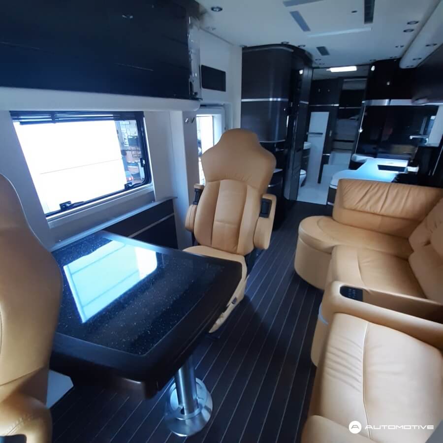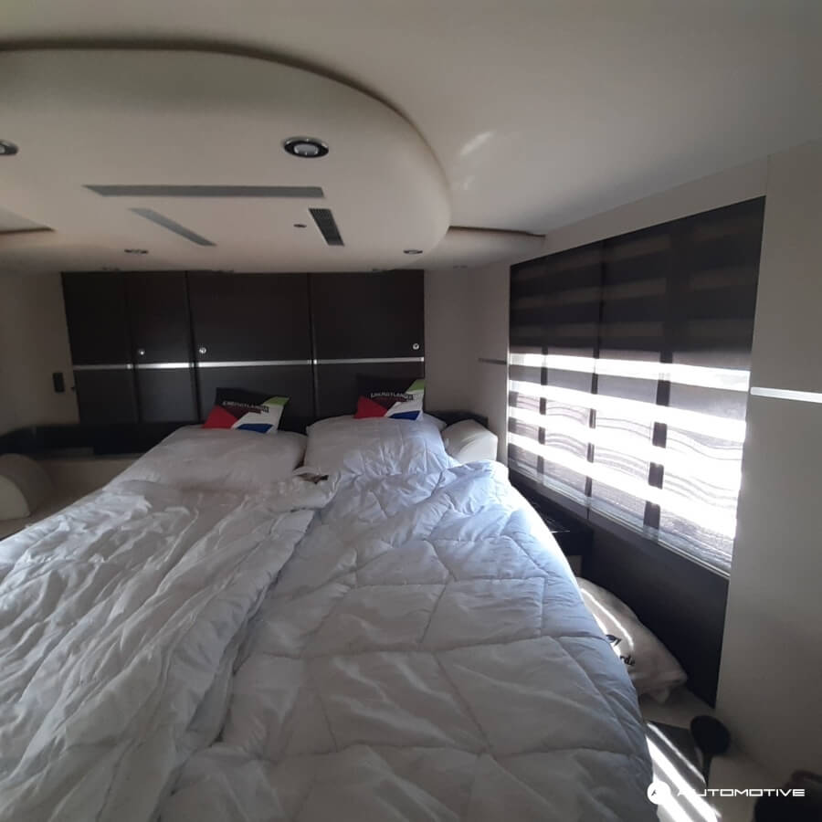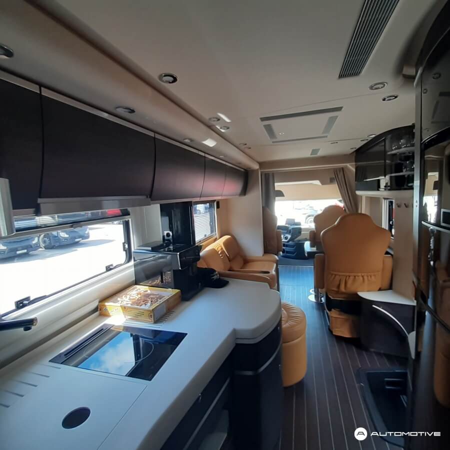 Przód pojazdu to tradycyjna kabina z miejscem kierowcy oraz fotelem dla pasażera. Za częścią kabinową znajduje się pokaźnych rozmiarów salon. Podążając w stronę tyłu samochodu, mijamy aneks kuchenny i przechodzimy przez elegancko wykończoną łazienkę, za którą znajduje się ogromna – jak na pojazd kempingowy – sypialnia. Nie jeden pokój hotelowy pozazdrościłby tak wysokiego standardu. Pomimo, że łazienka jest przechodnia, nie przeszkadza to w poruszaniu się po pokładzie.